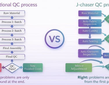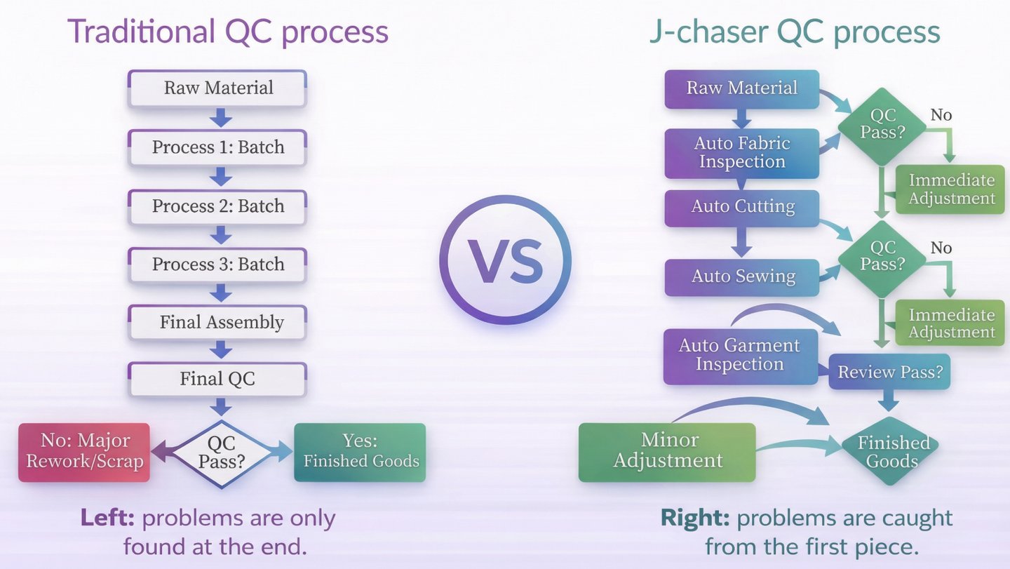 In contrast, J-Chaser’s QC process identifies and addresses issues at the earliest stages. From raw materials through to automatic fabric inspection, cutting, sewing, and garment inspection, every step is checked to ensure quality. If any problems are detected, immediate adjustments are made, ensuring that each product passes QC and proceeds smoothly into final production.