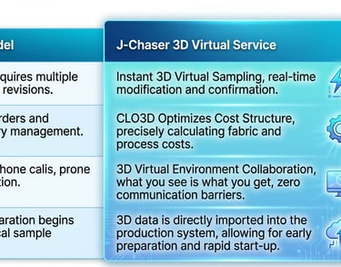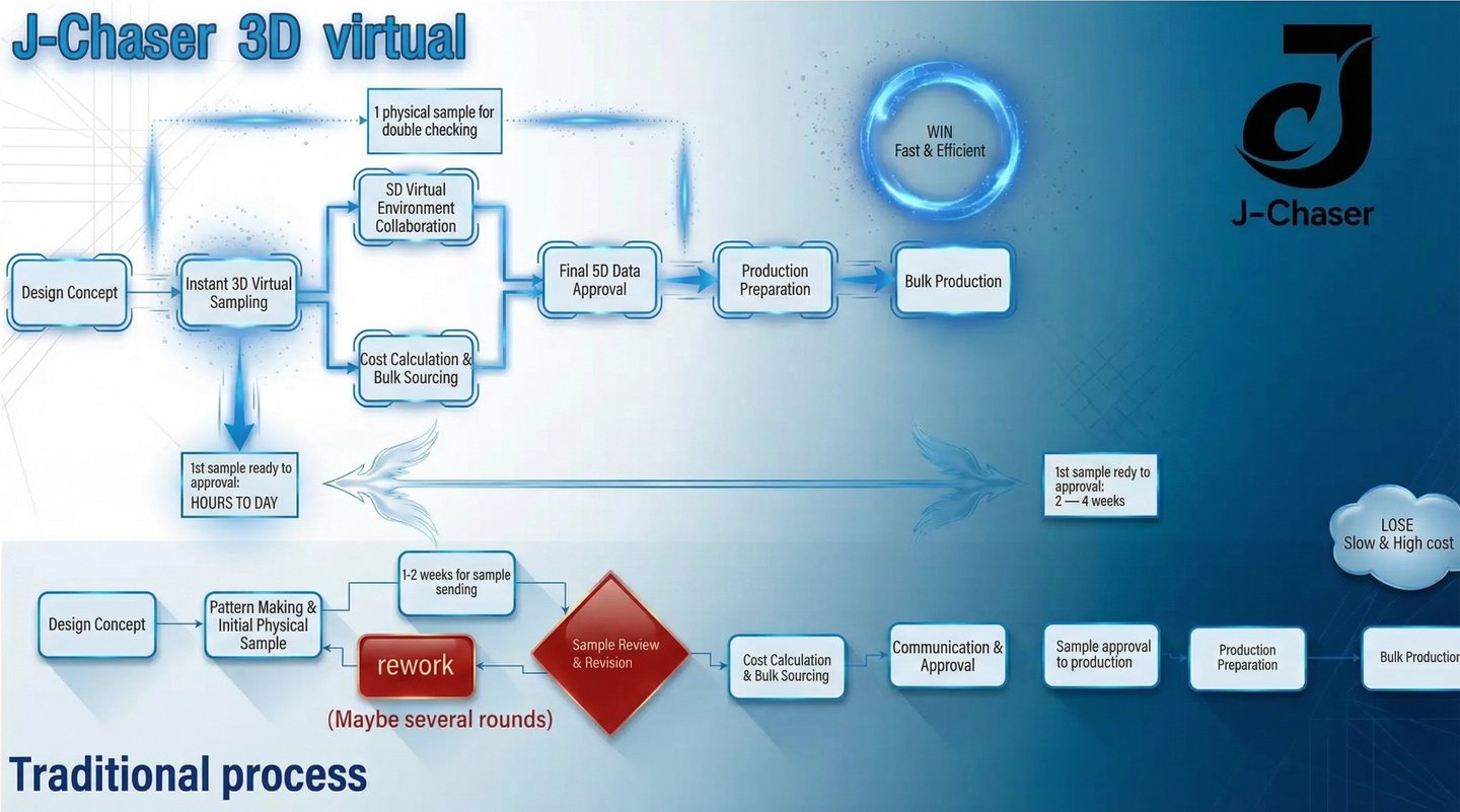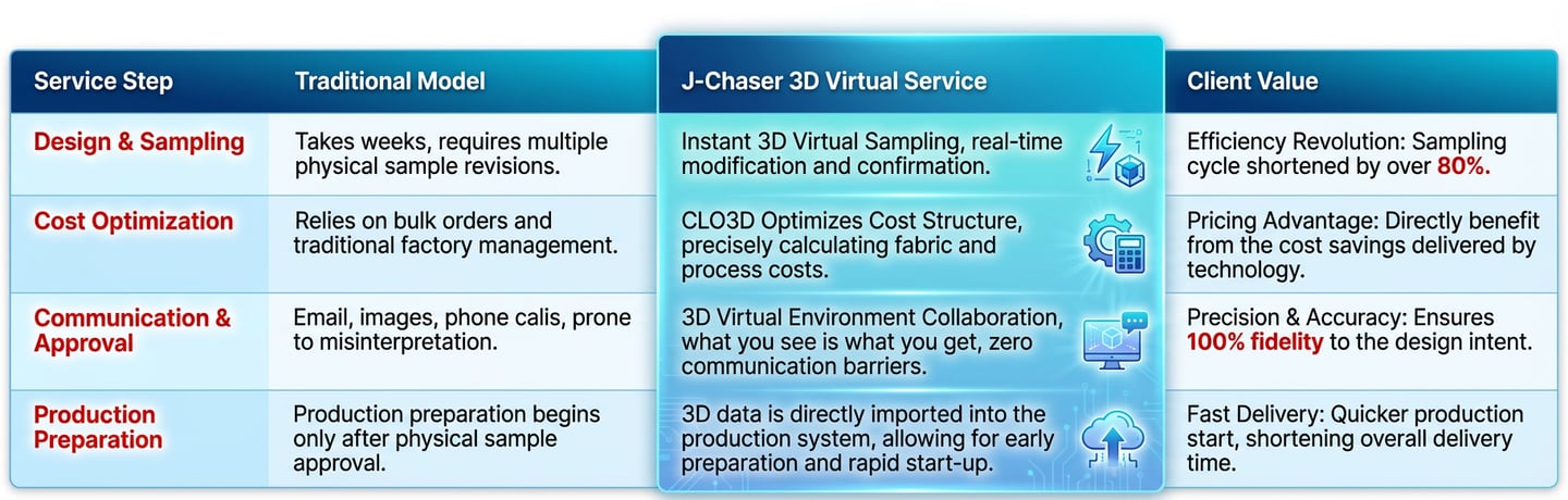 Traditional apparel sourcing is plagued by pain points such as long waiting times, communication difficulties, and high costs. J-Chaser deeply understands these challenges and has pioneered the integration of CLO3D 3D Virtual Garment Technology into our core workflow, fundamentally disrupting the conventional foreign trade model. Our core competence lies in optimizing the cost structure through CLO3D technology, which enables us to offer you the most competitive prices while significantly enhancing efficiency and accuracy. The service we provide is more than just garment manufacturing; it is a technology-driven, end-to-end optimized supply chain solution.