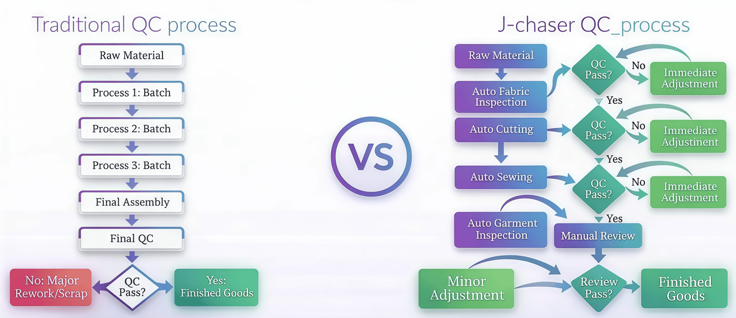 In contrast, J-Chaser’s QC process identifies and addresses issues at the earliest stages. From raw materials through to automatic fabric inspection, cutting, sewing, and garment inspection, every step is checked to ensure quality. If any problems are detected, immediate adjustments are made, ensuring that each product passes QC and proceeds smoothly into final production.