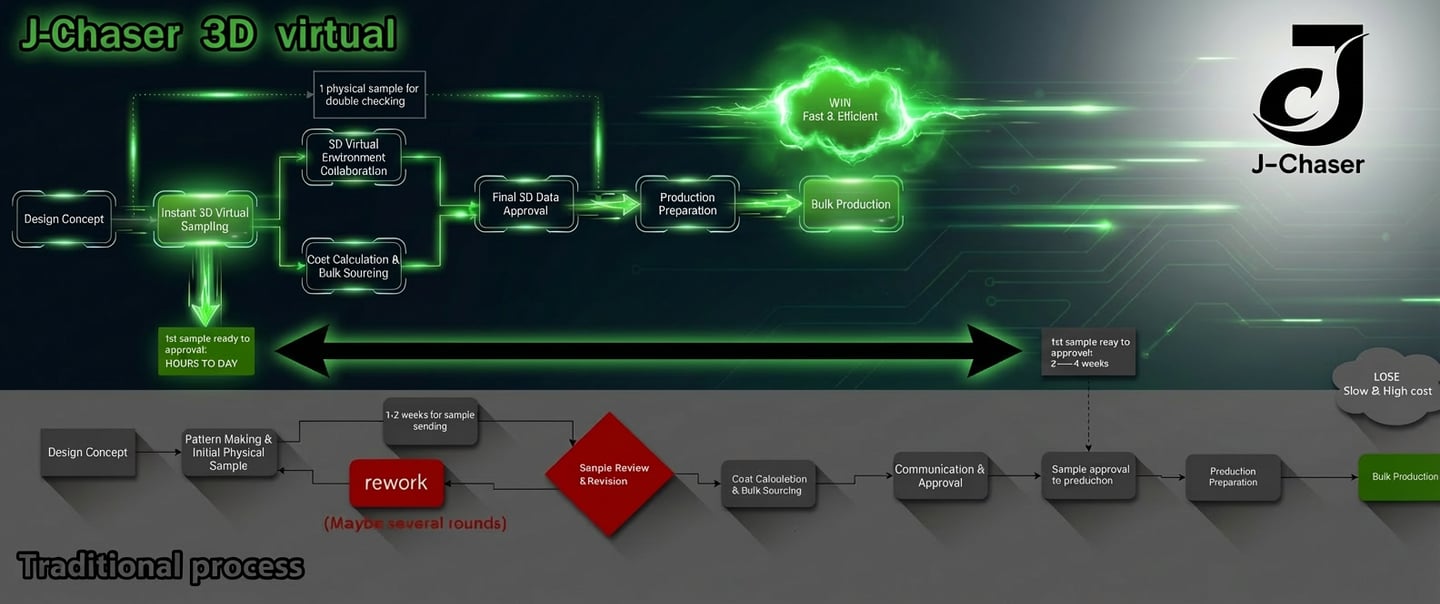 Traditional apparel sourcing is plagued by pain points such as long waiting times, communication difficulties, and high costs. J-Chaser deeply understands these challenges and has pioneered the integration of CLO3D 3D Virtual Garment Technology into our core workflow, fundamentally disrupting the conventional foreign trade model. Our core competence lies in optimizing the cost structure through CLO3D technology, which enables us to offer you the most competitive prices while significantly enhancing efficiency and accuracy. The service we provide is more than just garment manufacturing; it is a technology-driven, end-to-end optimized supply chain solution.